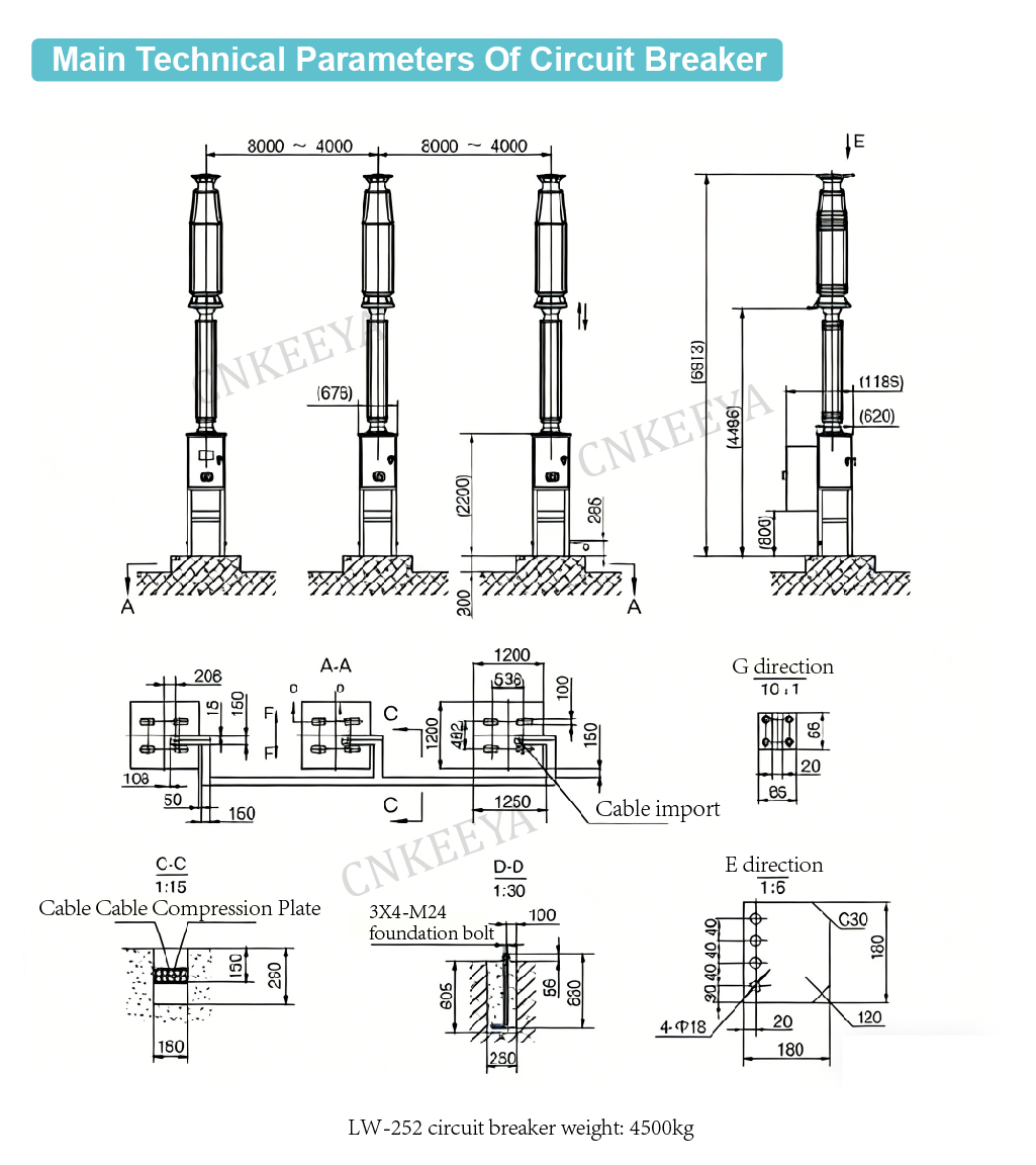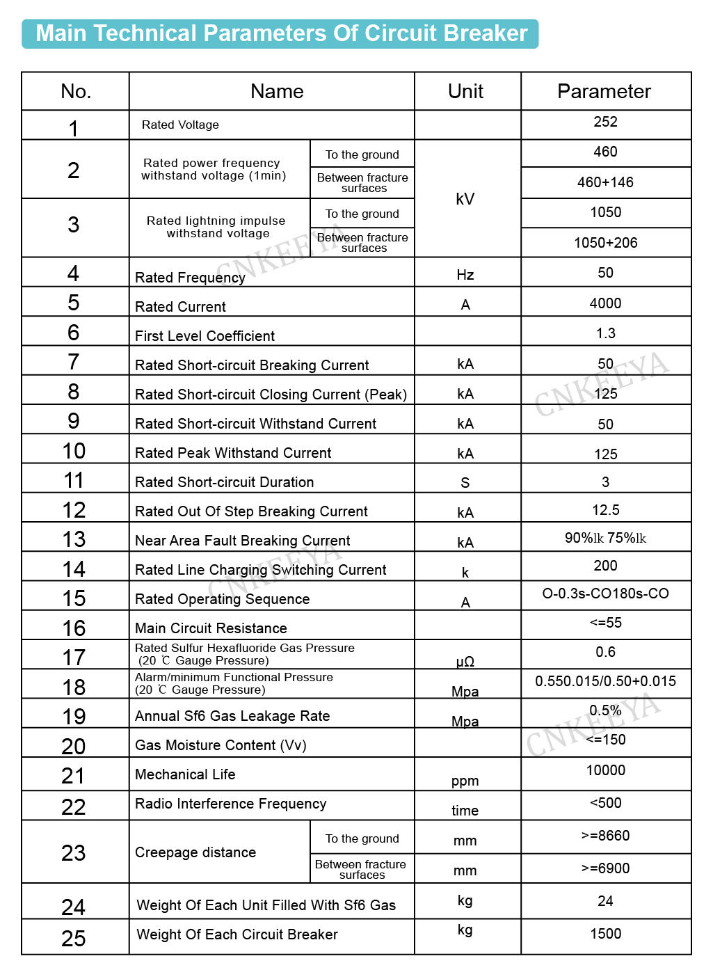 CNKEEYA,LW□-252 आउटडोर हाई-वोल्टेज एसी सल्फर हेक्साफ्लोराइड (SF₆) सर्किट ब्रेकर एक आउटडोर उत्पाद है, जो ऊंचाई ≤2000m, परिवेश तापमान ≥-30℃ और प्रदूषण वर्ग ≤IV वाले क्षेत्रों में 252kV के अधिकतम वोल्टेज के साथ 50Hz AC पावर ग्रिड पर लागू होता है। इसका उपयोग मुख्य रूप से रेटेड और फॉल्ट धाराओं को बाधित करने, सर्किट लाइनों को स्विच करने और इंटरकनेक्शन ब्रेकर के रूप में कार्य करने, बिजली प्रणालियों के कुशल नियंत्रण और सुरक्षा को साकार करने के लिए किया जाता है।
