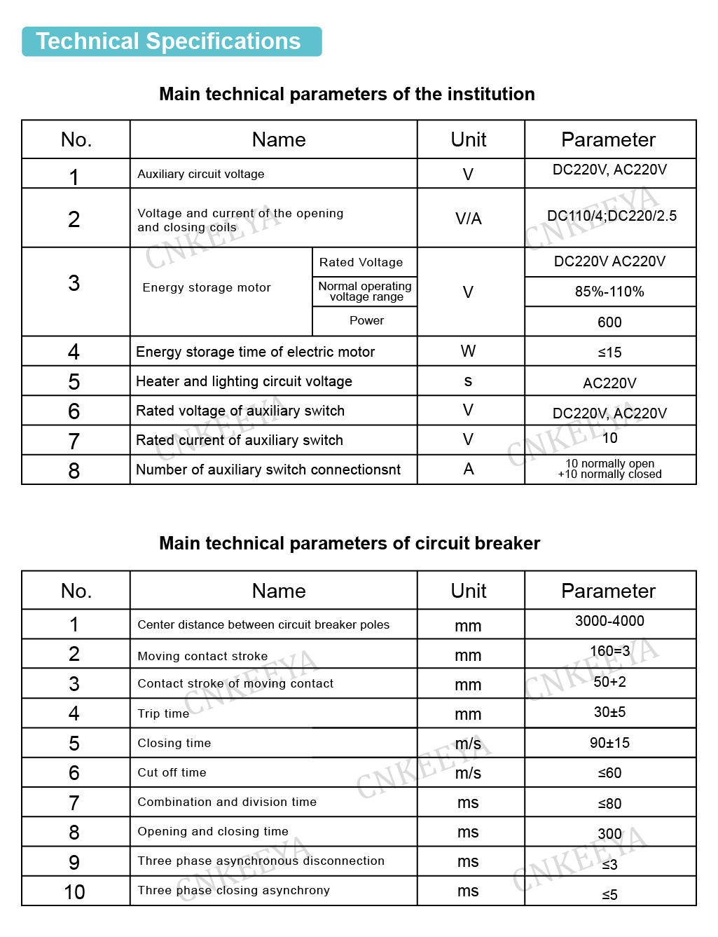 नियंत्रण सर्किट के रेटेड विद्युत पैरामीटर (ऊर्जा भंडारण मोटर का रेटेड वोल्टेज, उद्घाटन और समापन कॉइल का रेटेड वोल्टेज); आवश्यक स्पेयर पार्ट्स, विशेष उपकरण और औजारों के नाम और मात्रा (अलग से ऑर्डर करने के लिए); टर्मिनल की वायरिंग दिशा एक बार में।